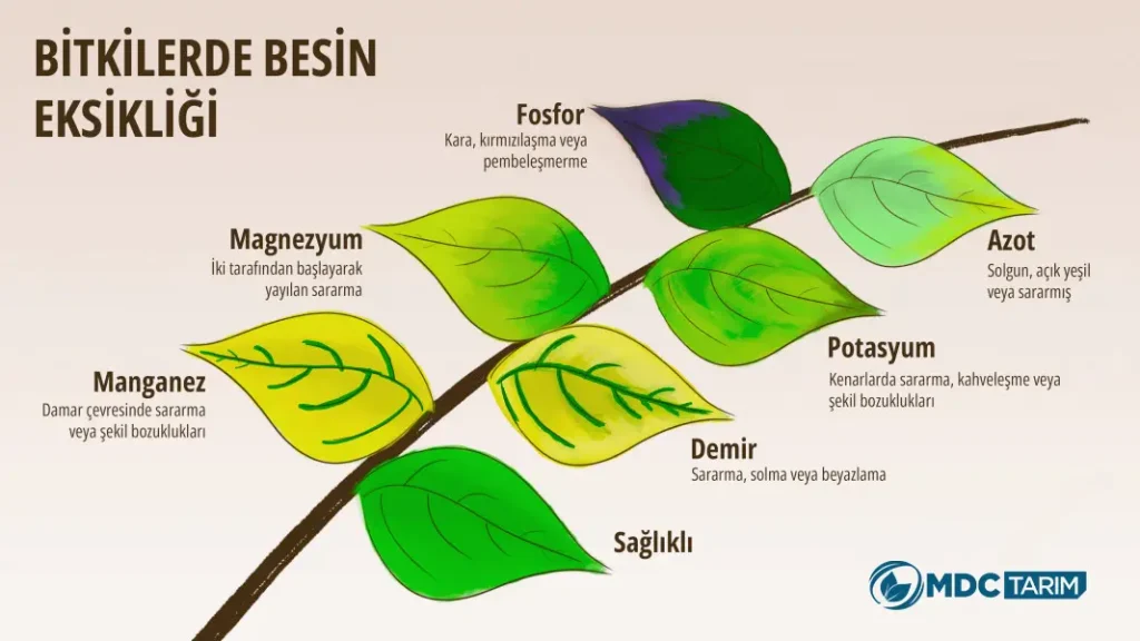 Magnezyum eksikliği durumunda yapraklarda sararma belirtileri görülür. Potasyum ise bitkilerin yaprak kenarlarında sararma ve kahverengileşme ile kendini belli edebilir. İz element eksikliklerinin belirtilerini doğru bir şekilde tanımak ve teşhis etmek, bitki sağlığı için önem teşkil etmektedir.